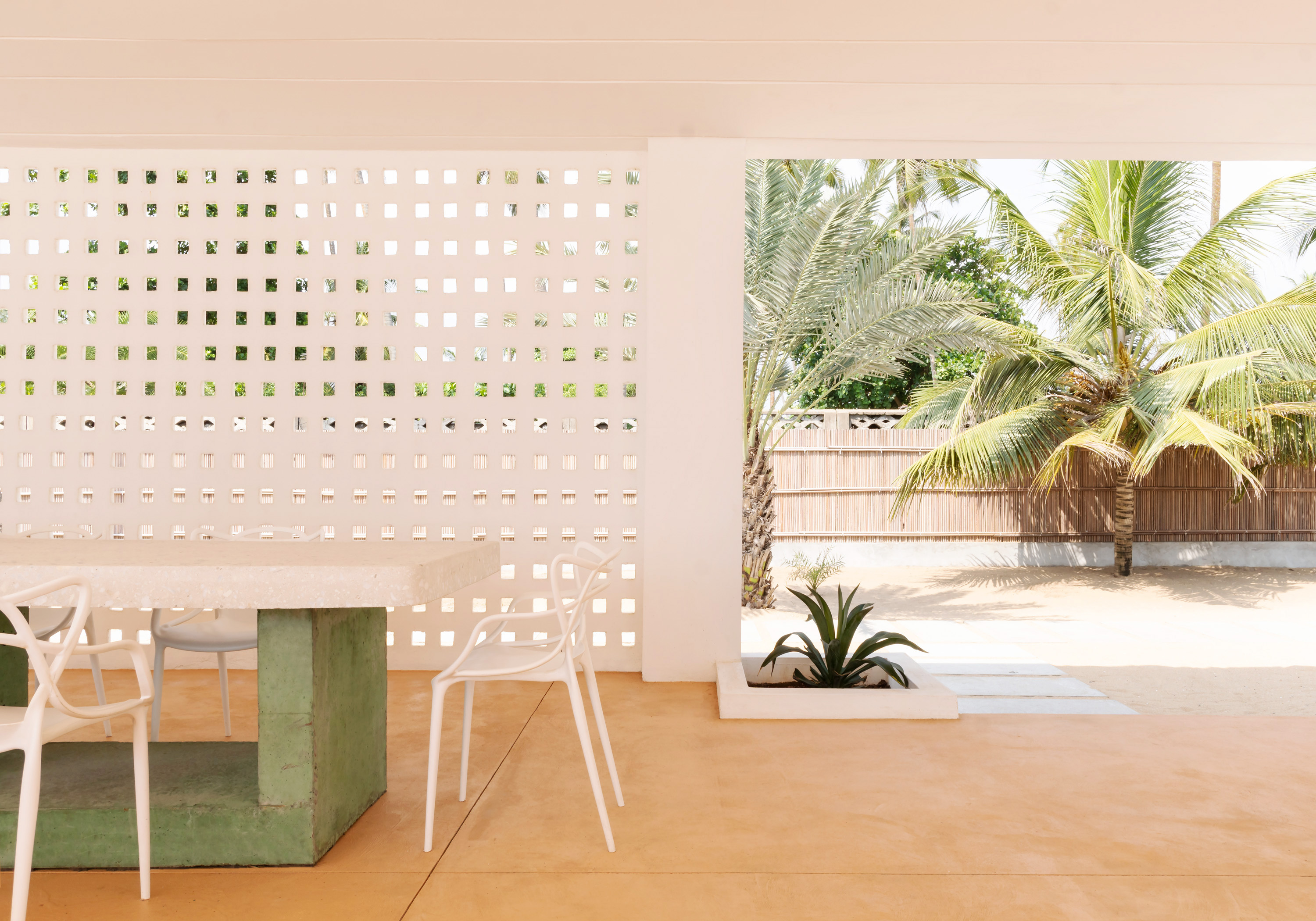 The building is designed to take full advantage of the directional wind and takes into account the equatorial location to build spaces where there are striking geometric lines of shade created by the sun year-round. Color played an important role in the pavilion from the calming aqua of the pool to the olive green accents in the furniture. The floating coral-pink pool deck contrasts elegantly against the golden yellow sand of the beach.