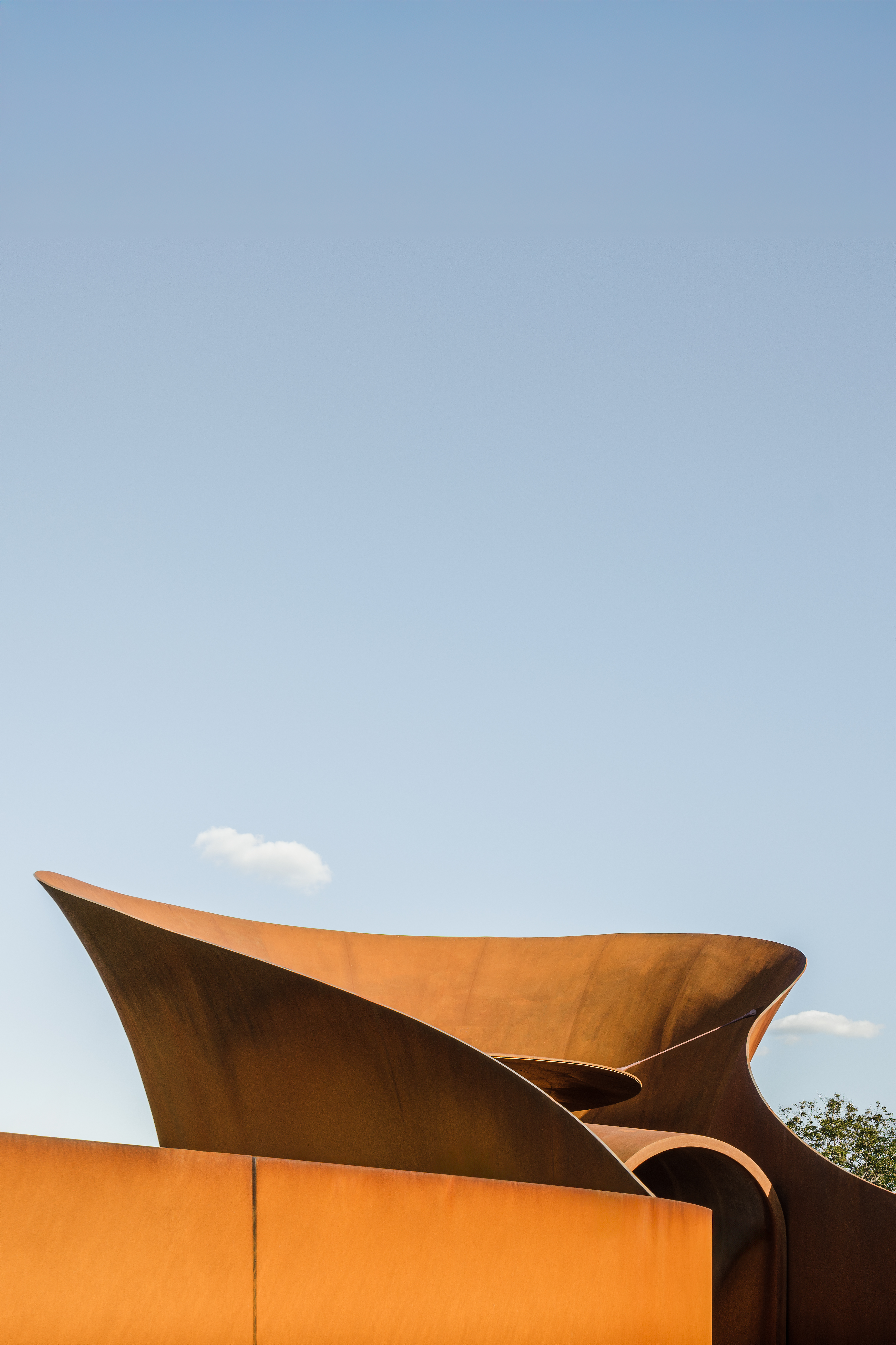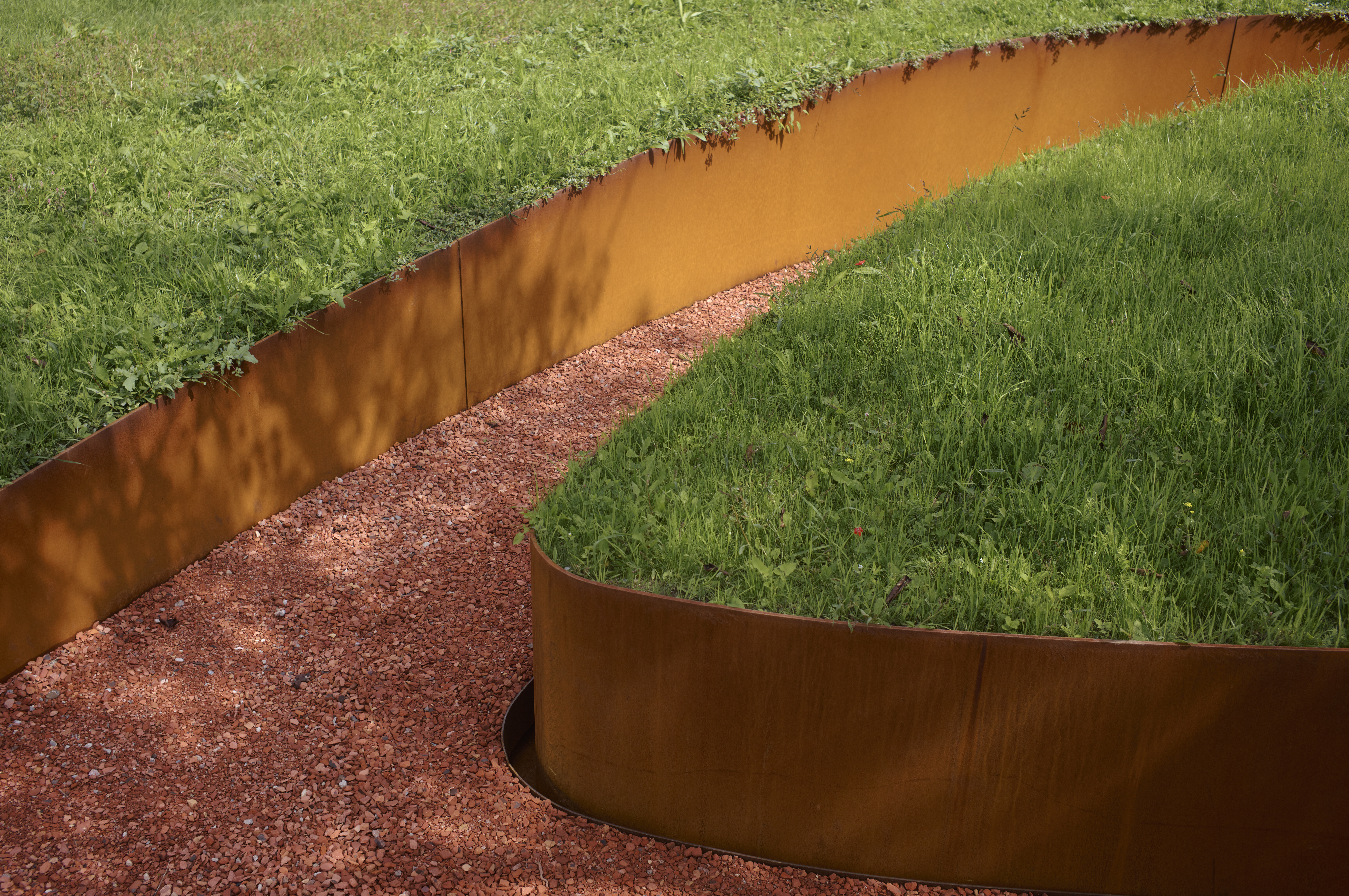 Above, the ceiling only partially encloses the chamber, creating an aperture for light, air and precipitation. A hand-hammered brass mandala – crafted in India – adorns the ceiling, casting refracted light. The structure of the Doshi Retreat is built from forged and formed XCarb® steel, an innovative low-carbon-emissions material made with a high proportion of scrap steel and produced entirely with renewable energy. Generously donated by ArcelorMittal, the steel naturally develops a warm patina over time through controlled corrosion. The sinuously shaped walls guide visitors along a pathway full of unexpected turns and shifting perspectives, enhancing the sense of discovery throughout the retreat.