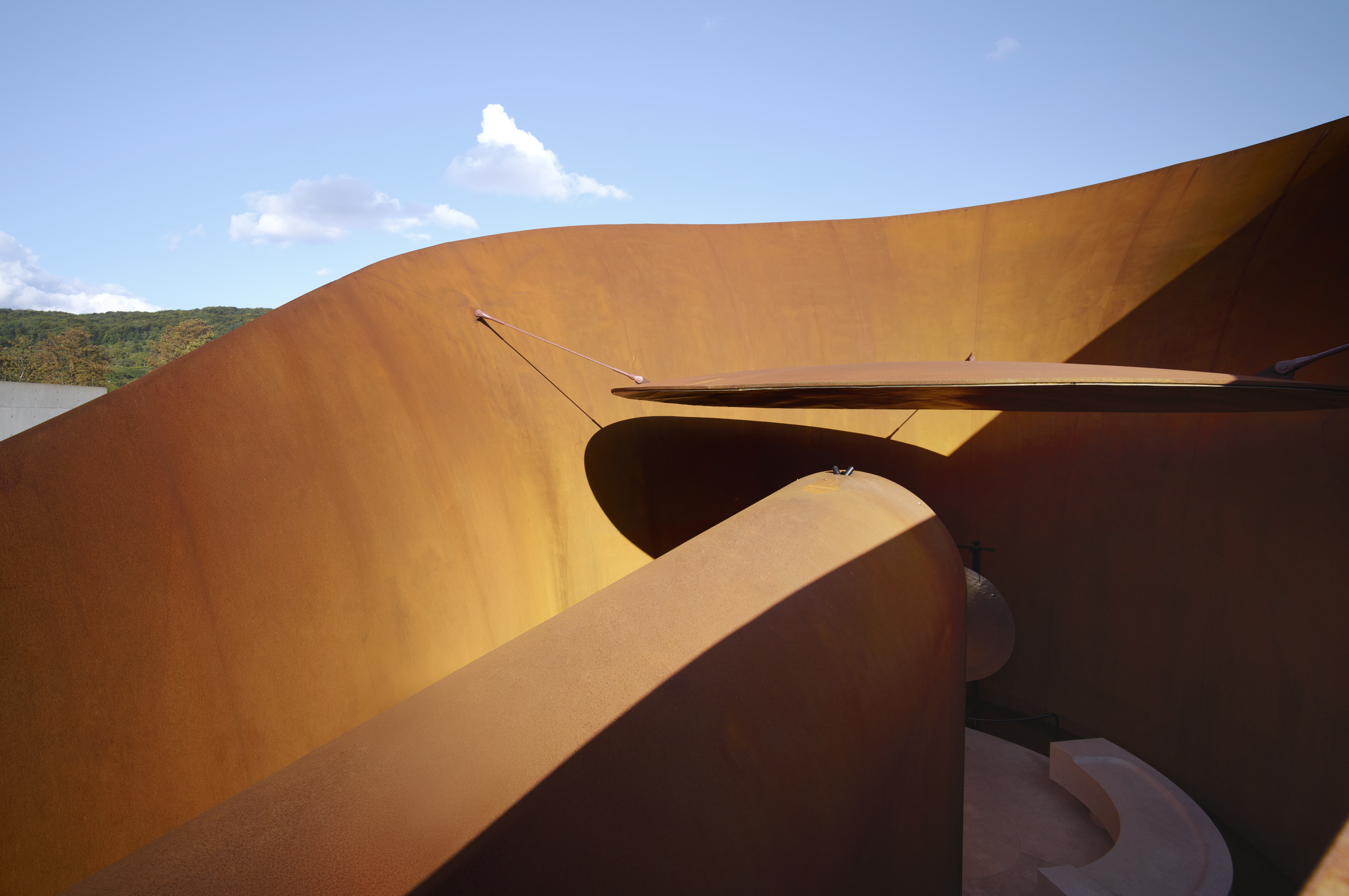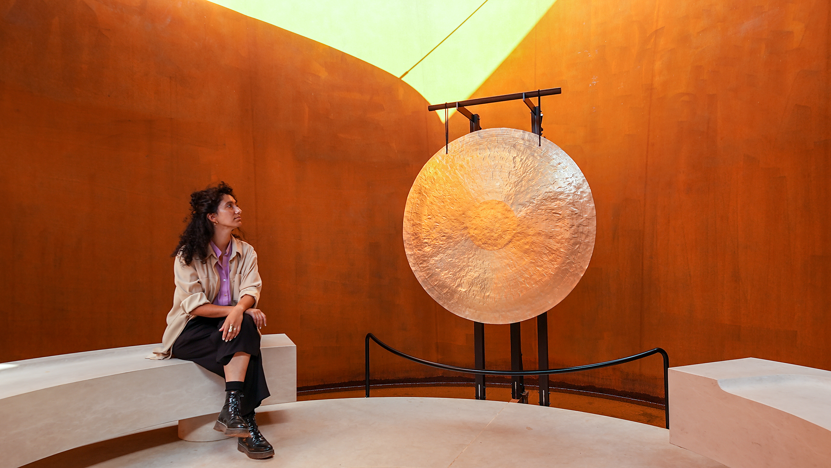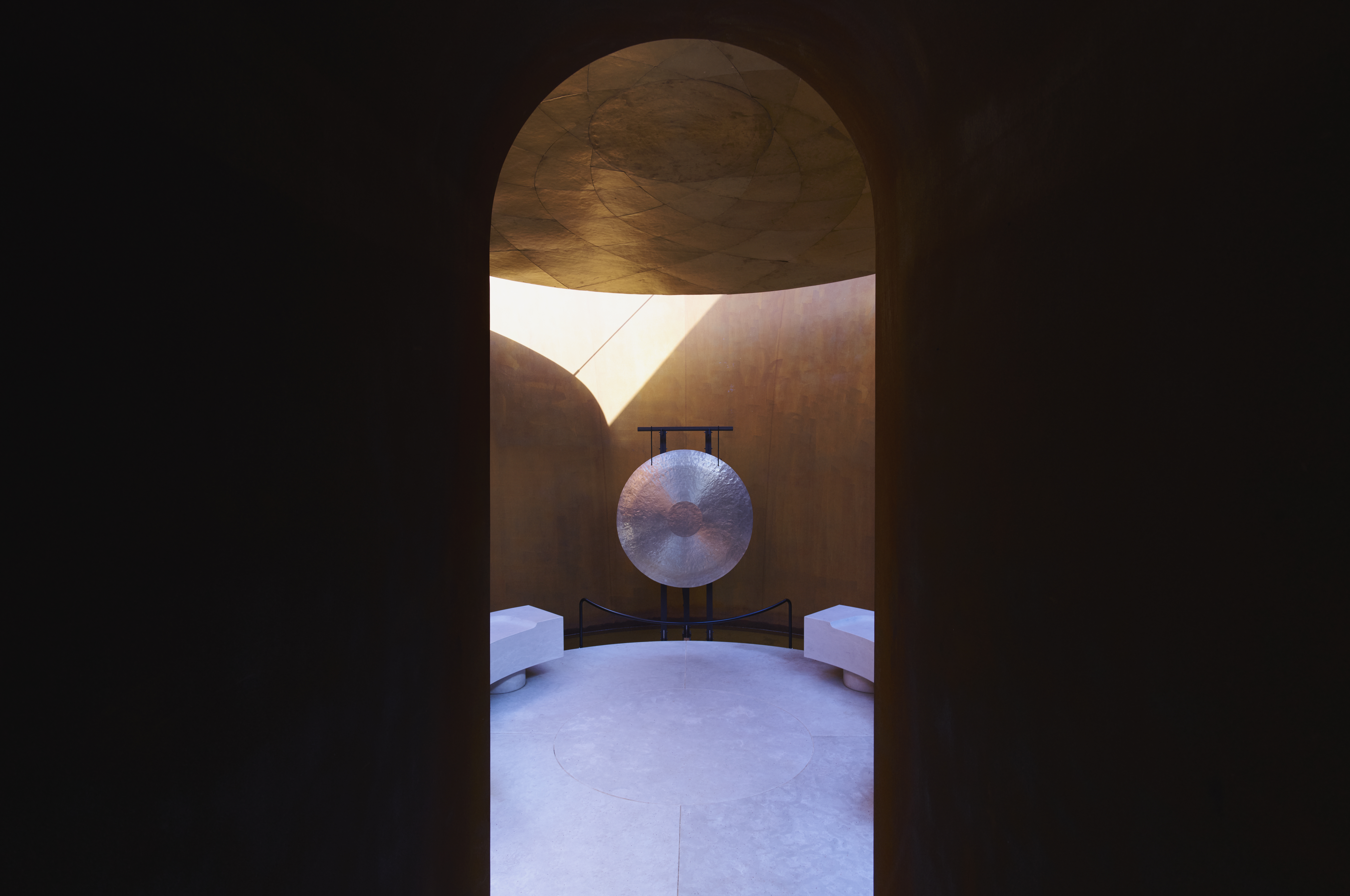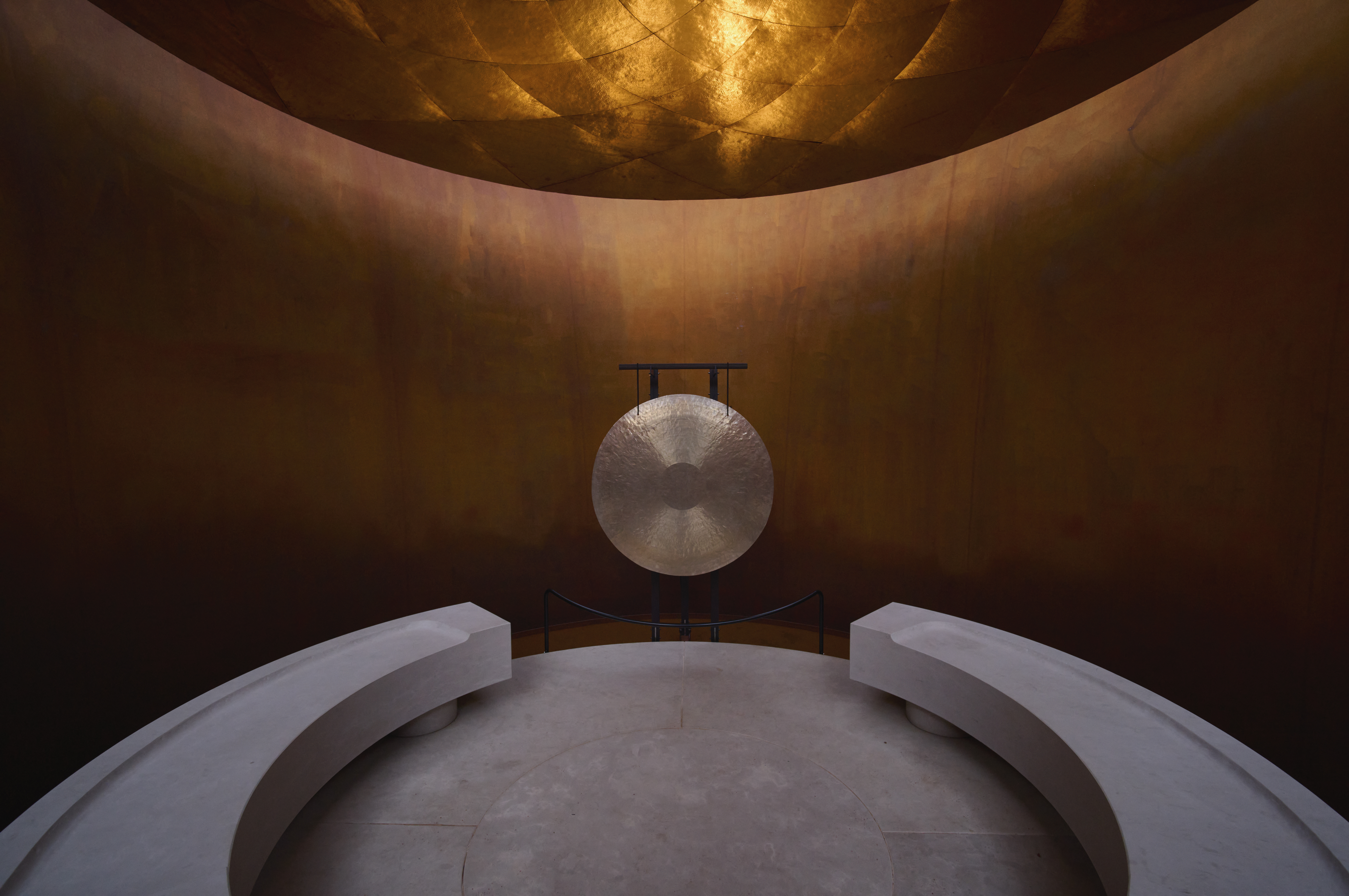 In kinship with the sensory environments found in Eastern temples or Christian sacred spaces, sound plays an integral role. A subtle audio system – embedded within concave recesses in the ground – diffuses a sequence of gong and ceramic flute sounds along the path. As one approaches the central structure, the sound is dispersed across the metal walls and interacts with the body in motion. This sensorial experience culminates in a short, arched tunnel that channels visitors into the contemplation chamber. The organically rounded space contains a rainwater basin encircling its base, two wide semicircular stone benches, and the gong in the centre.