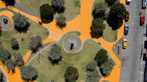 CROMA forms a temporary orange road spanning 10,000 square meters of public space in Quito’s historic center, a UNESCO World Heritage site in collaboration with paint brand Pintulac to celebrate one of their colors of the year