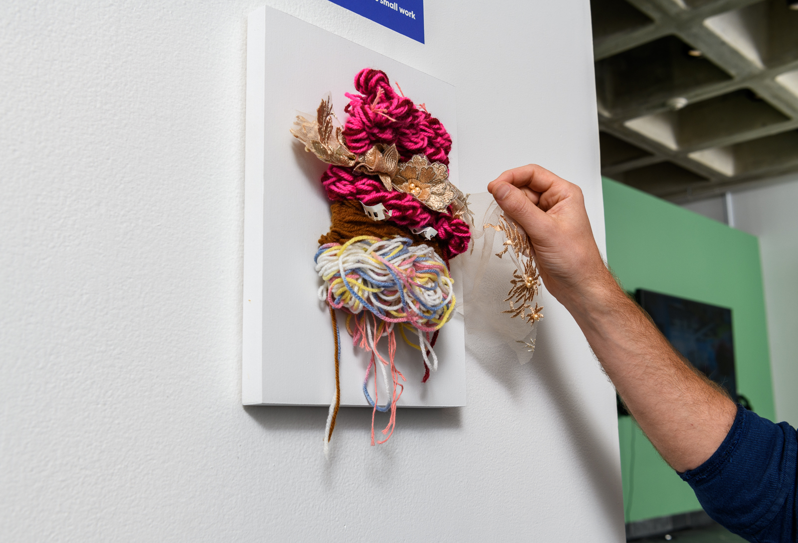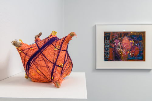 - Cindy Gosselin: Gosselin’s mixed-media sculptures are tactile works that explore texture and form. Created solely through touch as she is blind, the works are wrapped pieces formed of thread and found objects that express both the fragility and strength conveyed by ordinary materials.